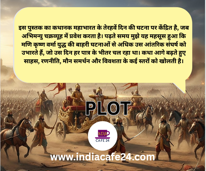 इस पुस्तक का कथानक महाभारत के तेरहवें दिन की घटना पर केंद्रित है, जब अभिमन्यु चक्रव्यूह में प्रवेश करता है। पढ़ते समय मुझे यह महसूस हुआ कि मणि कृष्ण वर्मा युद्ध की बाहरी घटनाओं से अधिक उस आंतरिक संघर्ष को उभारते हैं, जो उस दिन हर पात्र के भीतर चल रहा था। कथा आगे बढ़ते हुए साहस, रणनीति, मौन समर्थन और विवशता के कई स्तरों को खोलती है।