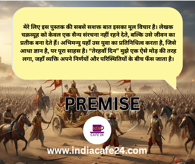 मेरे लिए इस पुस्तक की सबसे सशक्त बात इसका मूल विचार है। लेखक चक्रव्यूह को केवल एक सैन्य संरचना नहीं रहने देते, बल्कि उसे जीवन का प्रतीक बना देते हैं। अभिमन्यु यहाँ उस युवा का प्रतिनिधित्व करता है, जिसे आधा ज्ञान है, पर पूरा साहस है। “तेरहवाँ दिन” मुझे एक ऐसे मोड़ की तरह लगा, जहाँ व्यक्ति अपने निर्णयों और परिस्थितियों के बीच फँस जाता है।