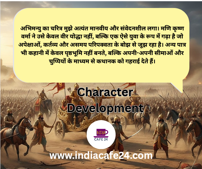 अभिमन्यु का चरित्र मुझे अत्यंत मानवीय और संवेदनशील लगा। मणि कृष्ण वर्मा ने उसे केवल वीर योद्धा नहीं, बल्कि एक ऐसे युवा के रूप में गढ़ा है जो अपेक्षाओं, कर्तव्य और असमय परिपक्वता के बोझ से जूझ रहा है। अन्य पात्र भी कहानी में केवल पृष्ठभूमि नहीं बनते, बल्कि अपनी-अपनी सीमाओं और चुप्पियों के माध्यम से कथानक को गहराई देते हैं।