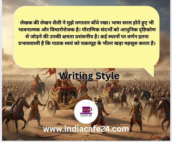 लेखक की लेखन शैली ने मुझे लगातार बाँधे रखा। भाषा सरल होते हुए भी भावनात्मक और विचारोत्तेजक है। पौराणिक संदर्भों को आधुनिक दृष्टिकोण से जोड़ने की उनकी क्षमता प्रशंसनीय है। कई स्थानों पर वर्णन इतना प्रभावशाली है कि पाठक स्वयं को चक्रव्यूह के भीतर खड़ा महसूस करता है।