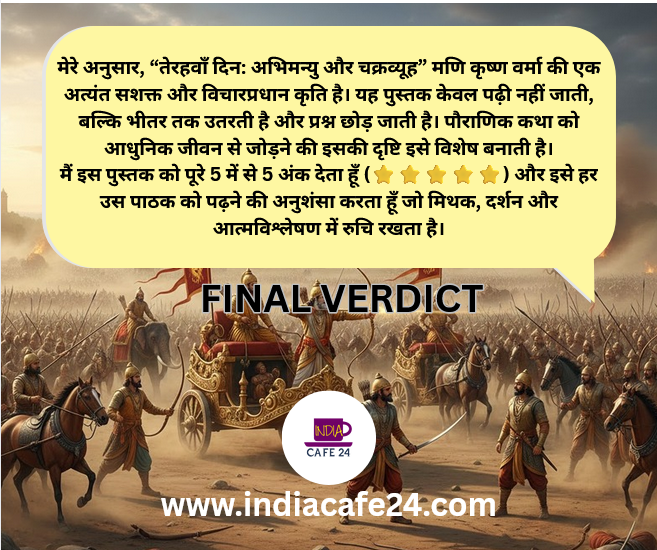 मेरे अनुसार, “तेरहवाँ दिन: अभिमन्यु और चक्रव्यूह” मणि कृष्ण वर्मा की एक अत्यंत सशक्त और विचारप्रधान कृति है। यह पुस्तक केवल पढ़ी नहीं जाती, बल्कि भीतर तक उतरती है और प्रश्न छोड़ जाती है। पौराणिक कथा को आधुनिक जीवन से जोड़ने की इसकी दृष्टि इसे विशेष बनाती है।
