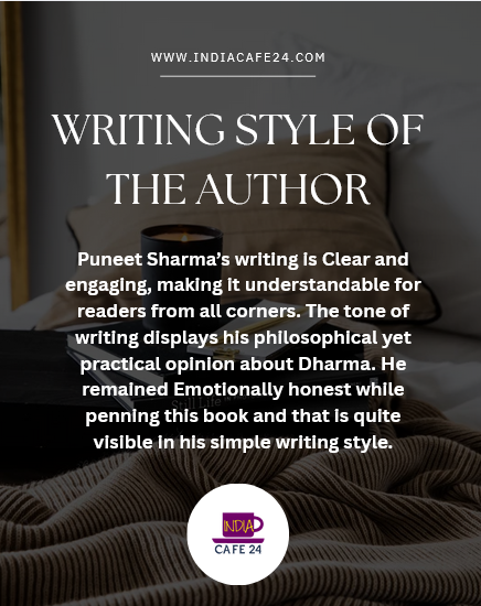 Puneet Sharma’s writing is Clear and engaging, making it understandable for readers from all corners. The tone of writing displays his philosophical yet practical opinion about Dharma. He remained Emotionally honest while penning this book and that is quite visible in his simple writing style.