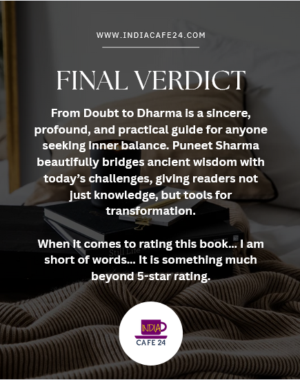 From Doubt to Dharma is a sincere, profound, and practical guide for anyone seeking inner balance. Puneet Sharma beautifully bridges ancient wisdom with today’s challenges, giving readers not just knowledge, but tools for transformation. The book is ideal for anyone ready to step out of doubt and walk toward purposeful, grounded, Dharma-aligned living. When it comes to rating this book… I am short of words… It is something much beyond 5-star rating.