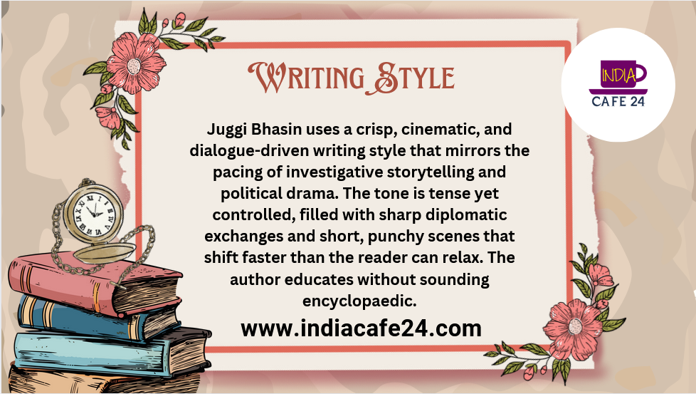 Juggi Bhasin uses a crisp, cinematic, and dialogue-driven writing style that mirrors the pacing of investigative storytelling and political drama. The tone is tense yet controlled, filled with sharp diplomatic exchanges and short, punchy scenes that shift faster than the reader can relax. The author educates without sounding encyclopaedic.The Narrative Flow is Smooth, engaging, visual-rich, and suspense-laced. Every chapter reads like an unfolding classified file, peppered with emotional residue, wit, urgency, and intelligence.