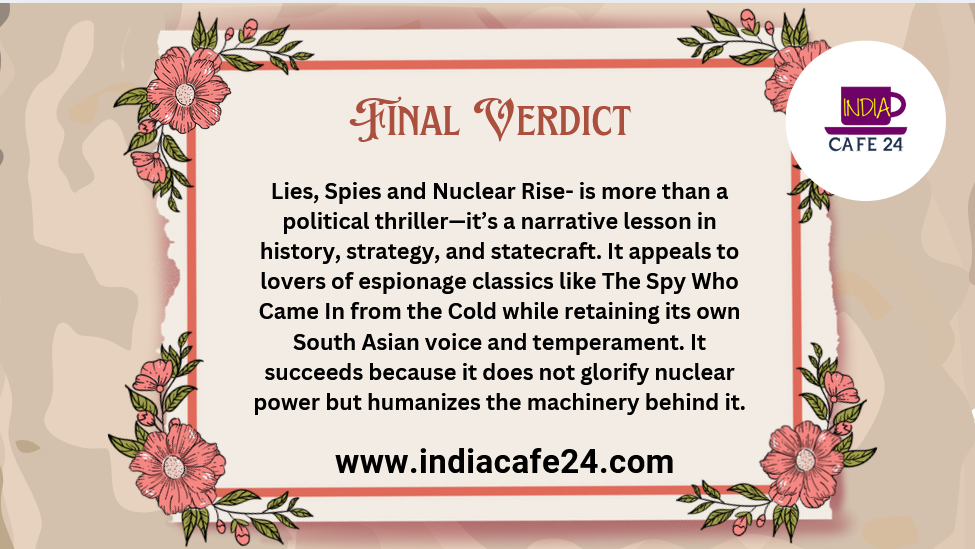 Lies, Spies and Nuclear Rise- is more than a political thriller—it’s a narrative lesson in history, strategy, and statecraft. It appeals to lovers of espionage classics like The Spy Who Came In from the Cold while retaining its own South Asian voice and temperament. It succeeds because it does not glorify nuclear power but humanizes the machinery behind it.My final rating: 4.6 / 5 for this book. It’s a perfect blend of suspense, intellectuality, emotion, and political sharpness. A must-read for anyone intrigued by geopolitics, foreign intelligence, and India’s strategic evolution.