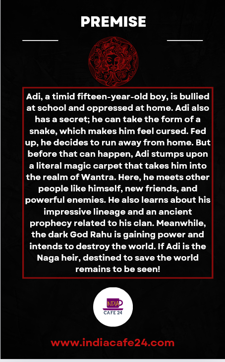 Adi, a timid fifteen-year-old boy, is bullied at school and oppressed at home. Adi also has a secret; he can take the form of a snake, which makes him feel cursed. Fed up, he decides to run away from home. But before that can happen, Adi stumps upon a literal magic carpet that takes him into the realm of Wantra. Here, he meets other people like himself, new friends, and powerful enemies. He also learns about his impressive lineage and an ancient prophecy related to his clan. Meanwhile, the dark God Rahu is gaining power and intends to destroy the world. If Adi is the Naga heir, destined to save the world remains to be seen!