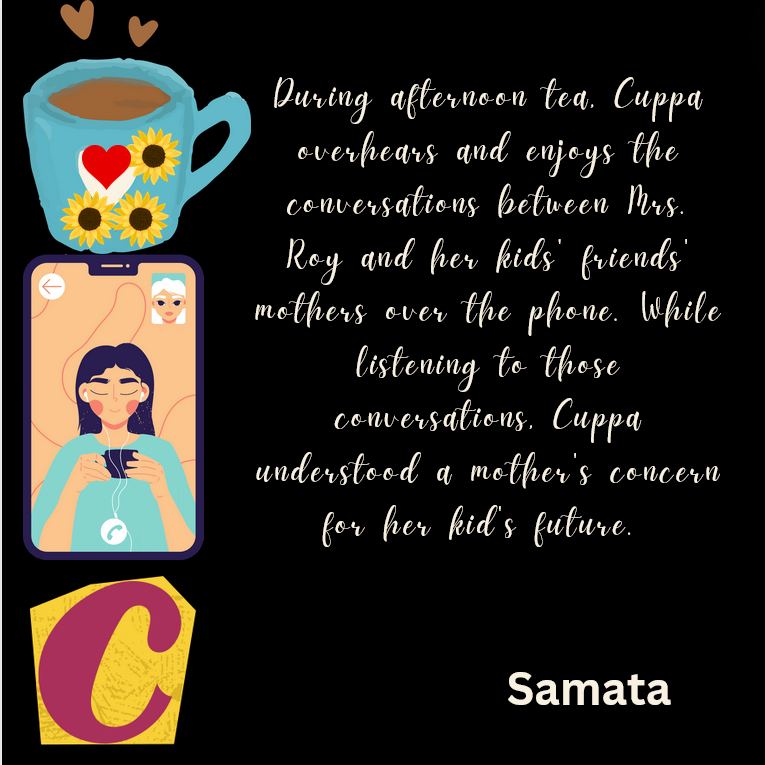 During afternoon tea, Cuppa overhears and enjoys the conversations between Mrs. Roy and her kids’ friends’ mothers over the phone. While listening to those conversations, Cuppa understood a mother’s concern for her kid’s future.