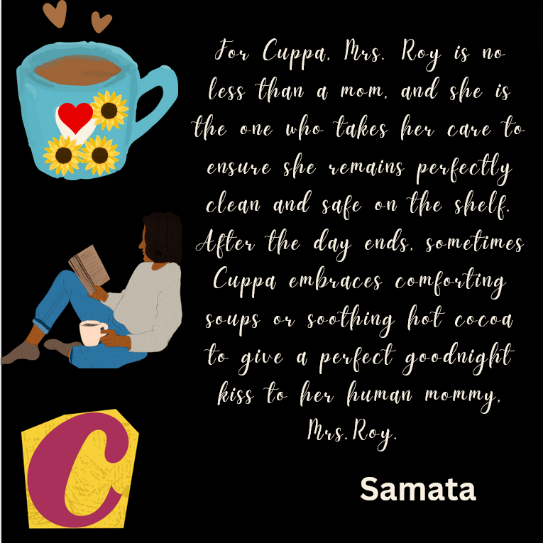 Cuppa is Mrs. Roy’s favorite companion when she wishes to take a sip of aromatic coffee or exotic tea to soothe her mind or energize her soul to be more creative and thoughtful. Each morning, Cuppa gets brimmed with the aroma of coffee to give Mrs. Roy the lift to start the morning with positive vibes.