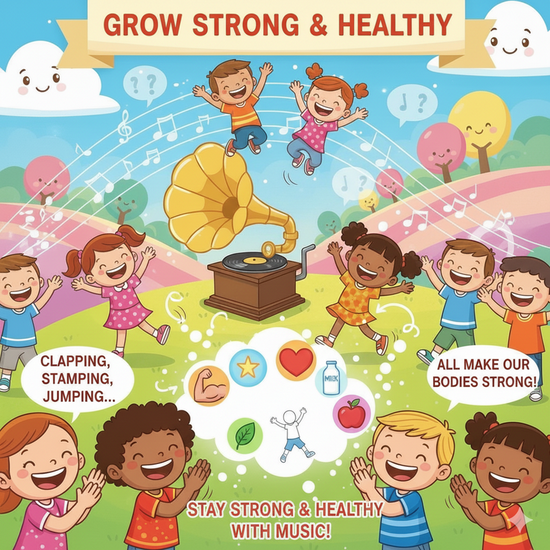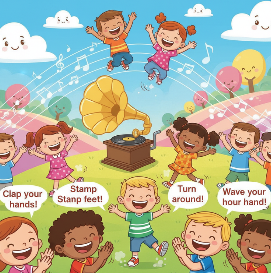 Do you know that clapping, stamping, turning, and jumping- All these actions help our body grow strong? So, following the instructions of this rhyme actually helps to stay strong and healthy