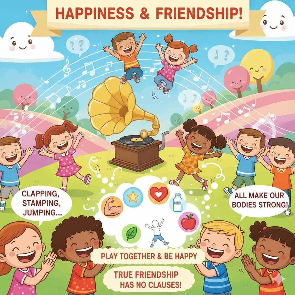 When we clap and move with friends, it makes us happy because we all play together. When we stay happy with friends, it helps to strengthen the bond. True friendship comes with no clauses.