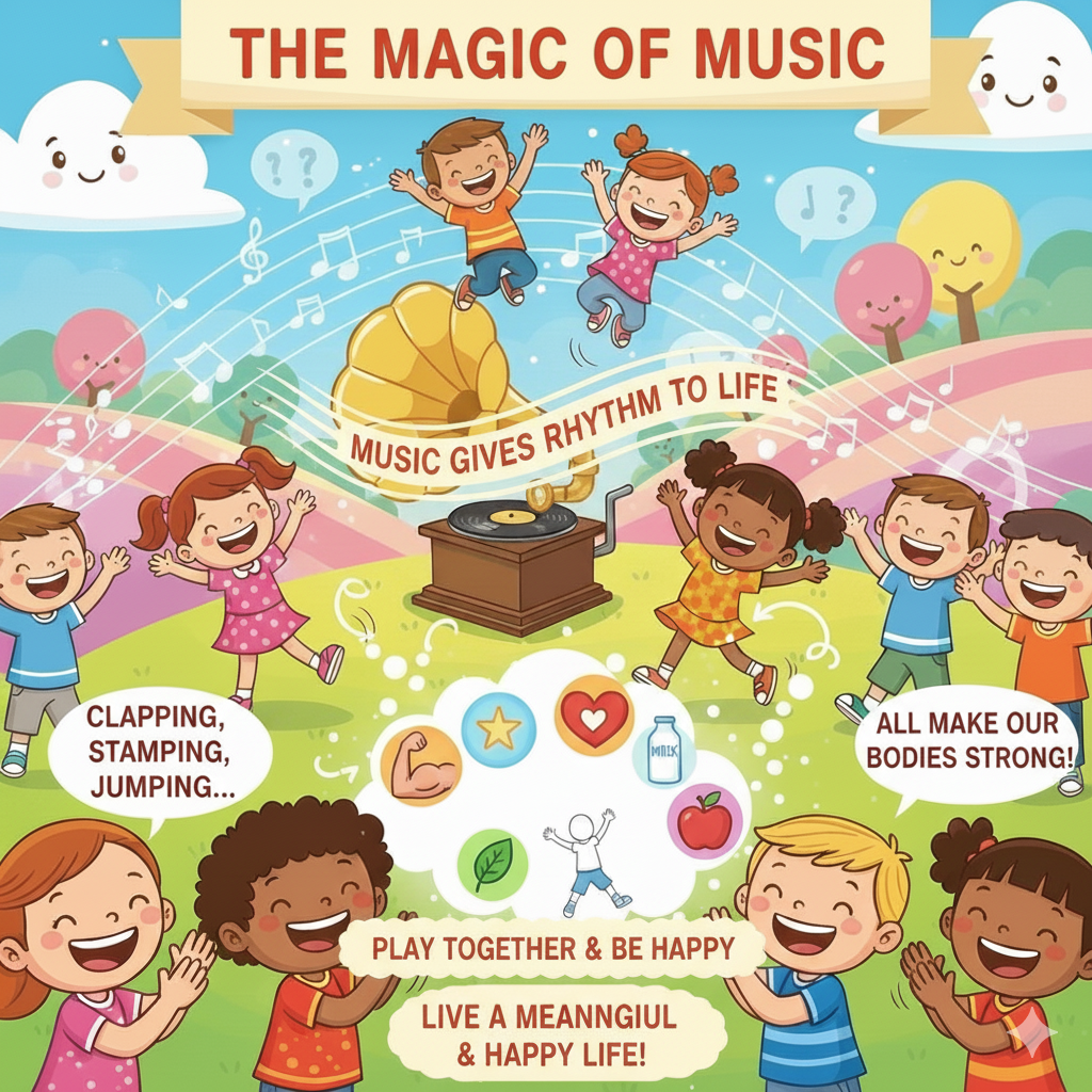 Music is like magic—it makes us want to move, laugh, and enjoy. Music gives rhythm to life, which in turn turns it more meaningful and happy.