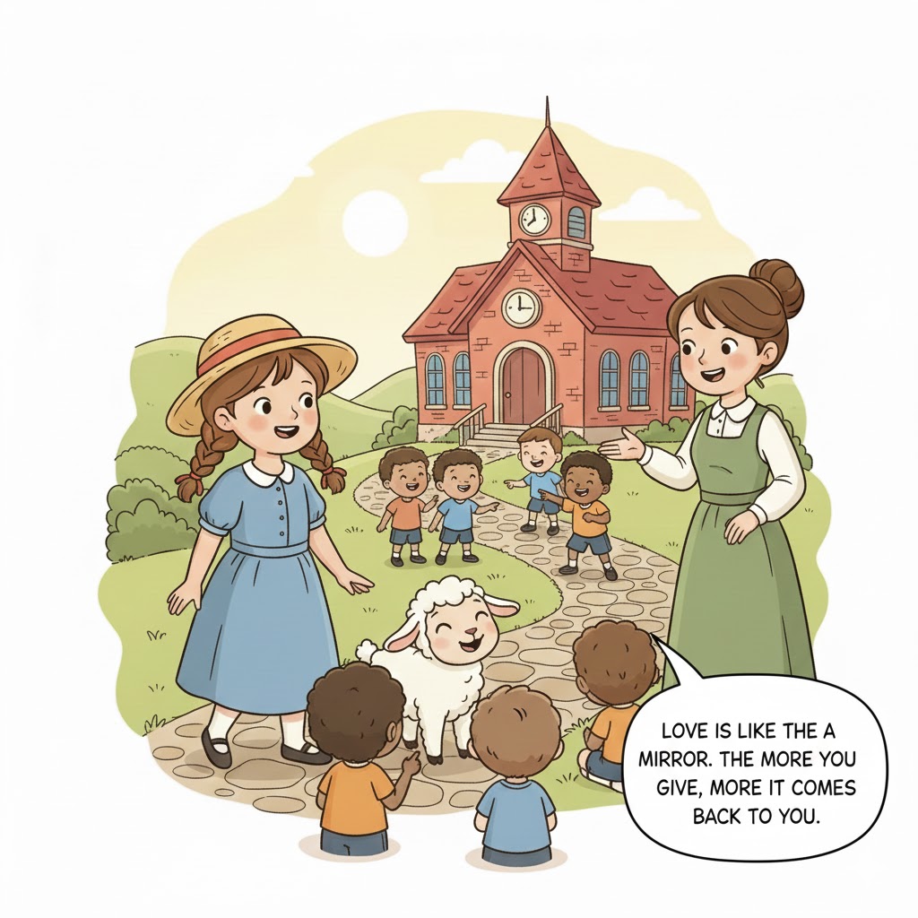 The teacher explains that the lamb loves Mary because Mary loves the lamb too. Love is like a mirror. The more you give it, the more it comes back to you. When you love someone truly, they care for you too. Love is magical.