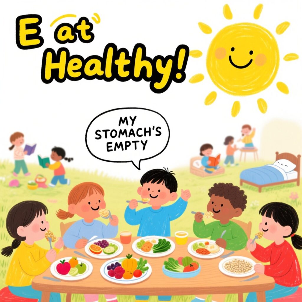 At the end, it says ‘my stomach’s empty,’ which means we should eat on time and take care of our body. Eating healthy food gives us energy to play, study, and grow strong! Everyone should follow a routine and take care of meal time, healthy eating, exercise and rest.