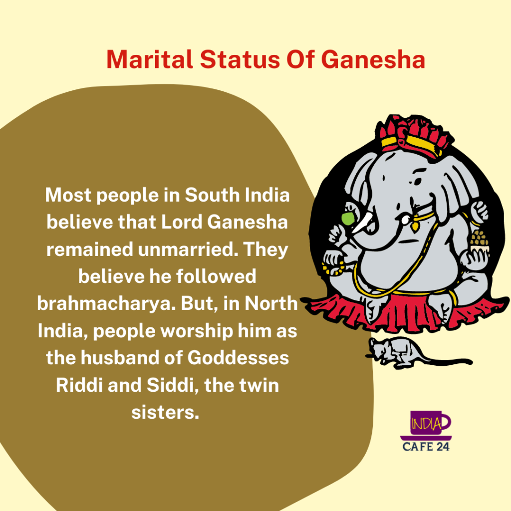 Most people in South India believe that Lord Ganesha remained unmarried. They believe he followed brahmacharya. But, in North India, people worship him as the husband of Goddesses Riddi and Siddi, the twin sisters.